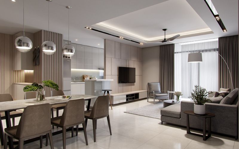 Vì vậy, cần lựa chọn các mẫu trần thạch cao phòng khách liền bếp tinh tế, đảm bảo đồng thời 2 yếu tố thẩm mỹ và công năng sử dụng hiệu quả.